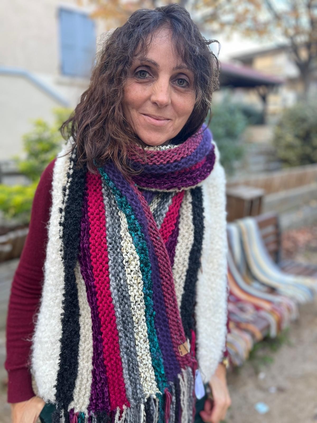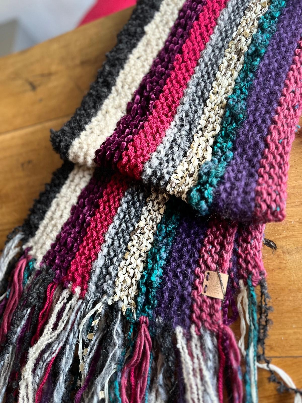 Echarpe fabriquée en France et tricotée à l’aiguille – rayures – mélange de matières et de textures – douce – tons mauves, gris, beiges, roses – Pièce unique